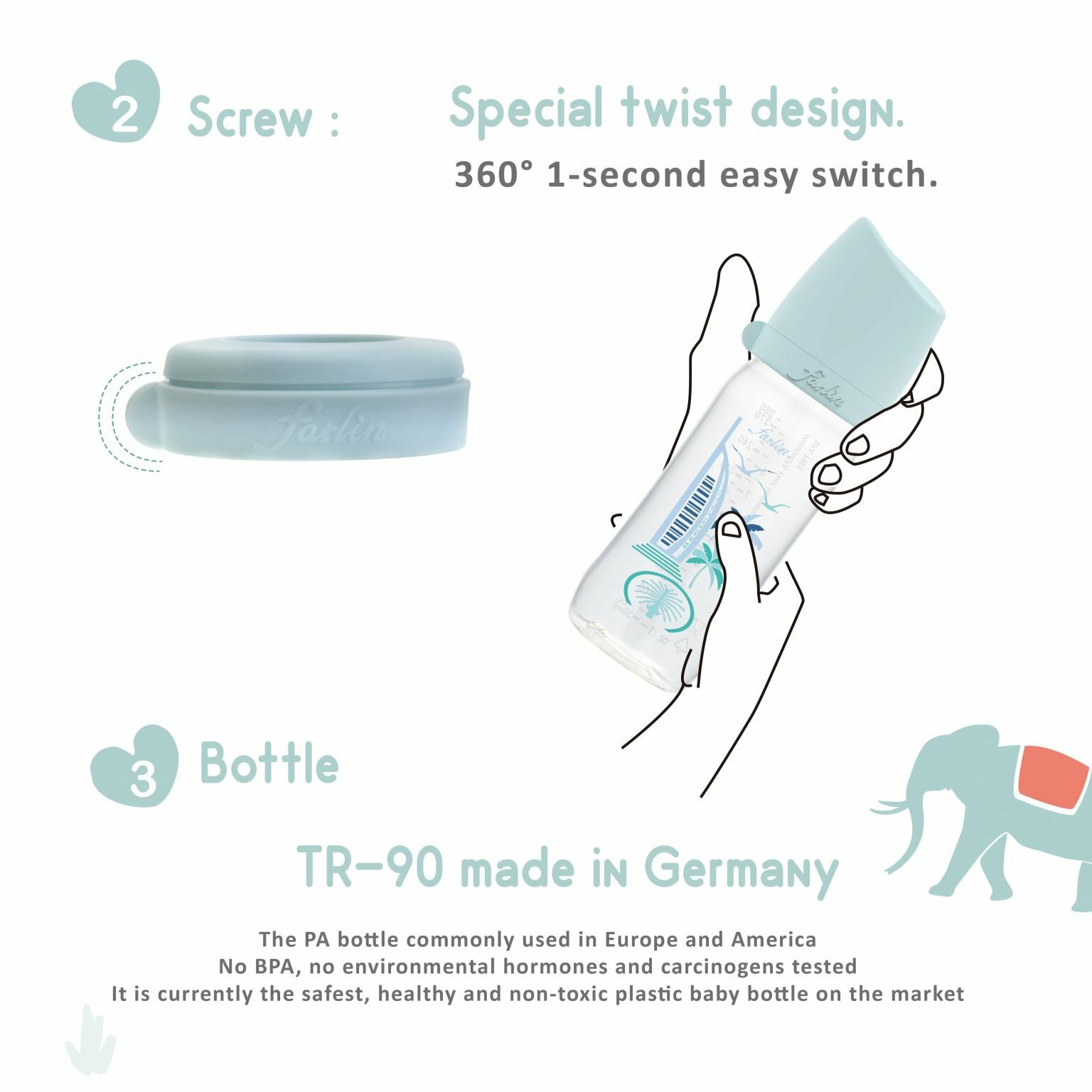 ˙Ergonomic bottle design.