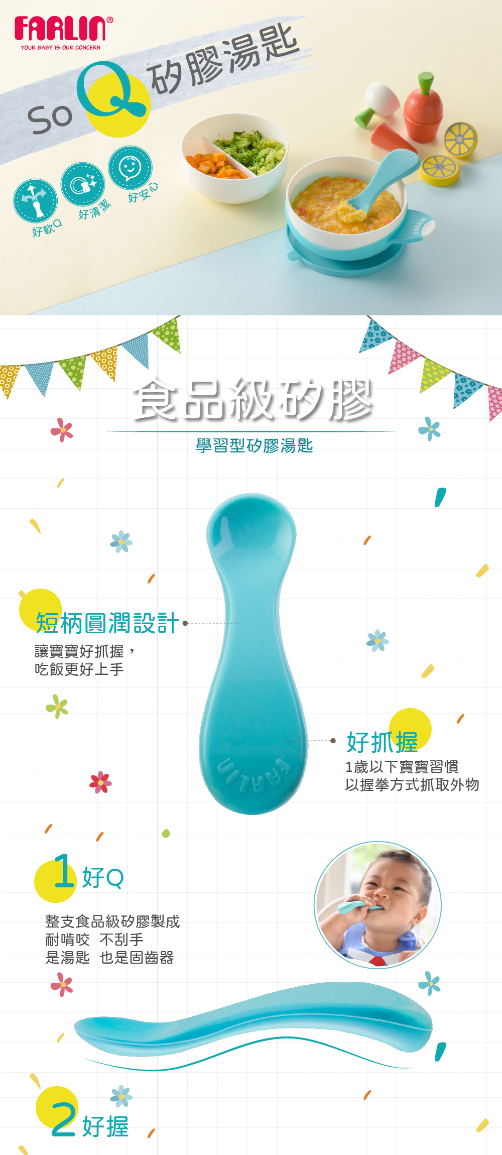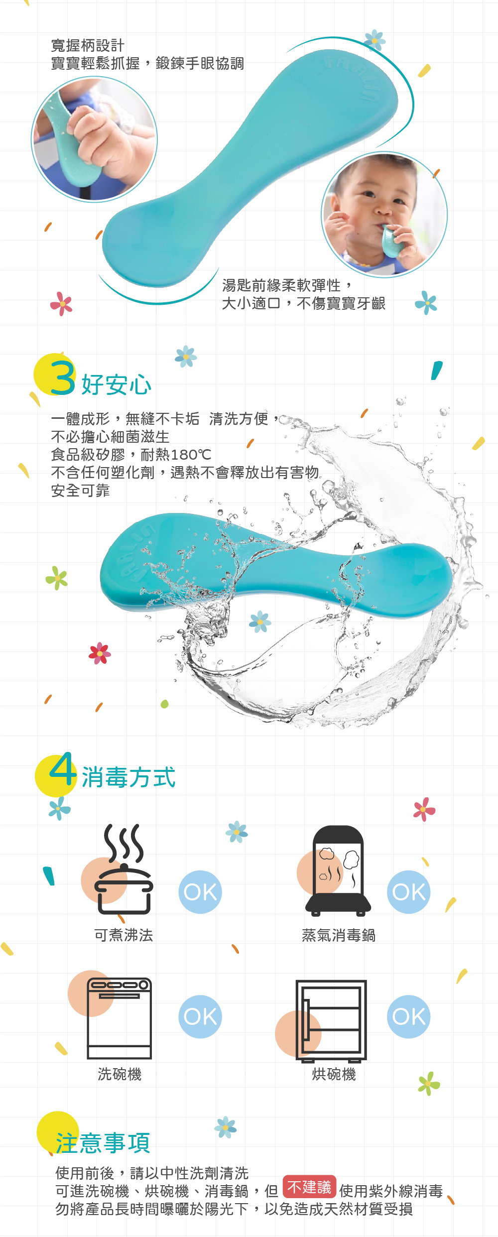 ˙湯匙前緣柔軟彈性,大小適口,不傷寶寶牙齦